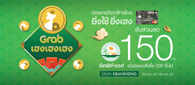 บัตรเครดิตกสิกรไทย ยิ่งใช้ยิ่งเฮง รับส่วนลด GrabFood 150 บาท เมื่อมียอดสั่งซื้อ 500 บาทขึ้นไป โดยใส่รหัส KBANKHENG