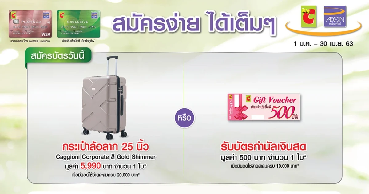 - รับกระเป๋าล้อลาก Caggioni Corporate (Gold Shimmer) ขนาด 25 นิ้วมูลค่า 5,990 บาท จำนวน 1 ใบ เมื่อมียอดอิออน แฮปปี้ เพย์ (ยอดผ่อนชำระ) / เบิกถอนเงินสดสะสมครบ 20,000 บาท ภายใน 60 วัน นับจากวันที่ได้รับอนุมัติบัตร - ผู้ถือบัตรเครดิตและบัตรสินเชื่อต้องลงทะเบียนเข้าร่วมรายการส่งเสริมการขายผ่านช่องทางที่บริษัทฯกำหนดภายใน 60 วัน นับจากวันที่ได้รับอนุมัติบัตร โดยลงทะเบียน 1 ครั้ง / หมายเลขบัตรเครดิตหรือบัตรสินเชื่อบิ๊กซี ดังนี้