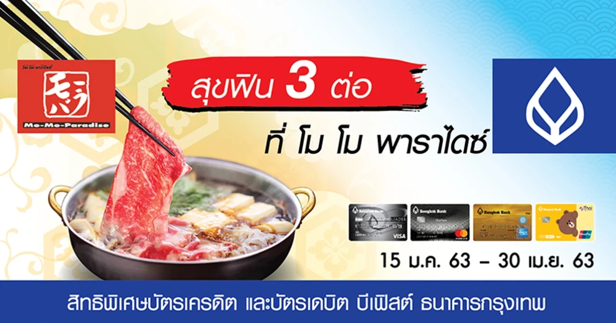 - สำหรับผู้ถือบัตรที่ใช้จ่ายผ่านบัตรเครดิตและบัตรเดบิต บีเฟิสต์ ธนาคารกรุงเทพ ยอดรวมสูงสุด 11 ท่านแรก ที่ร้าน Mo-Mo-Paradise ทุกสาขาระหว่างวันที่ 15 ม.ค. 63 - 30 เม.ย. 63 โดยมียอดใช้จ่ายรวมตลอดรายการขั้นต่ำ 15,000 บาทขึ้นไป