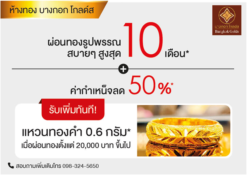 - สอบถามรายละเอียดและเงื่อนไขเพิ่มเติมที่ร้านค้าที่ท่านใช้บริการ เฉพาะร้านทองในเครือเยาวราชกรุงเทพ และห้างทองบางกอกโกลด์ส ตามที่บริษัทฯ กำหนดเท่านั้น