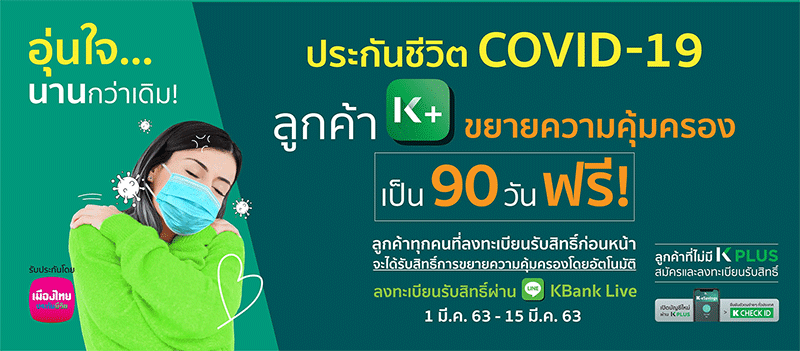 ลูกค้า KPLUS ขยายความคุ้มครองจากเดิม 30 วัน เป็น 90 วัน ฟรี!! ความคุ้มครองระดับพรีเมียม! ประกันชีวิต COVID-19 เพียงลงทะเบียนรับสิทธิ์ผ่าน Line KBank Live ภายในวันที่ 29 ก.พ. - 15 มี.ค. 63