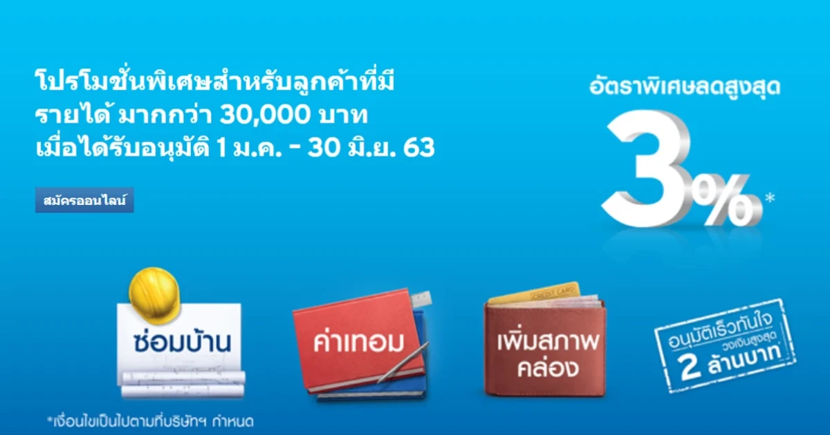 - วงเงินอนุมัติสินเชื่อบุคคลสูงสุดไม่เกิน 2,000,000 บาท