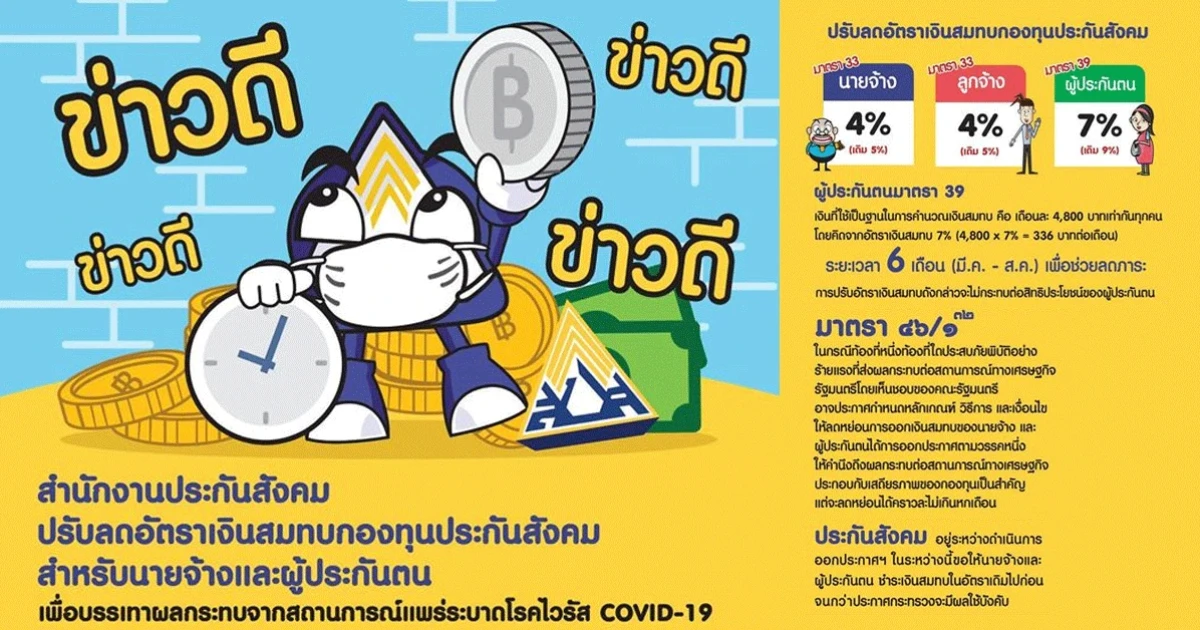 กระทรวงแรงงาน สั่งปรับลดจ่ายเงินสมทบ "ประกันสังคม" เหลือ 4% ของค่าจ้าง ระยะเวลา 6 เดือน