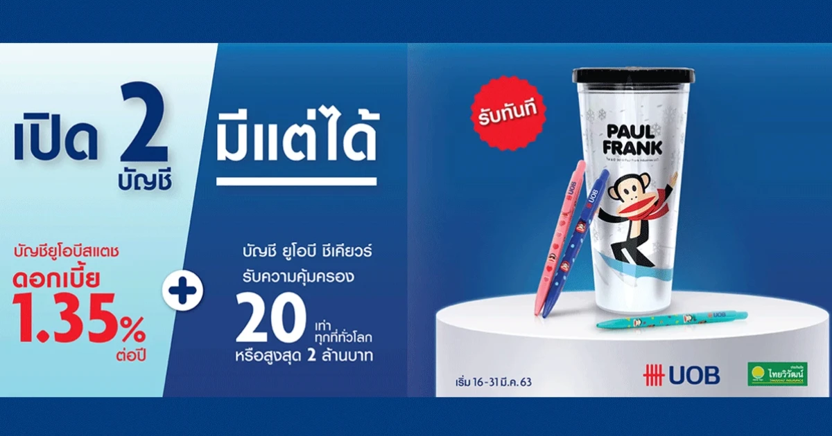 - สำหรับลูกค้าใหม่ที่เปิดบัญชีออมทรัพย์ ยูโอบี สแตช และ ยูโอบี ซีเคียวร์ พร้อมกัน โดยเปิดบัญชีตั้งแต่ 10,000 บาท/บัญชี ระหว่างวันที่ 16 - 31 มี.ค. 63 ลูกค้าจะได้รับ แก้วน้ำ Paul Frank มูลค่า 490 บาท จำนวน 1 ชิ้น และ เชตปากกา Paul Frank มูลค่า 390 บาท จำนวน 1 ชุด ในวันที่เปิดบัญชี