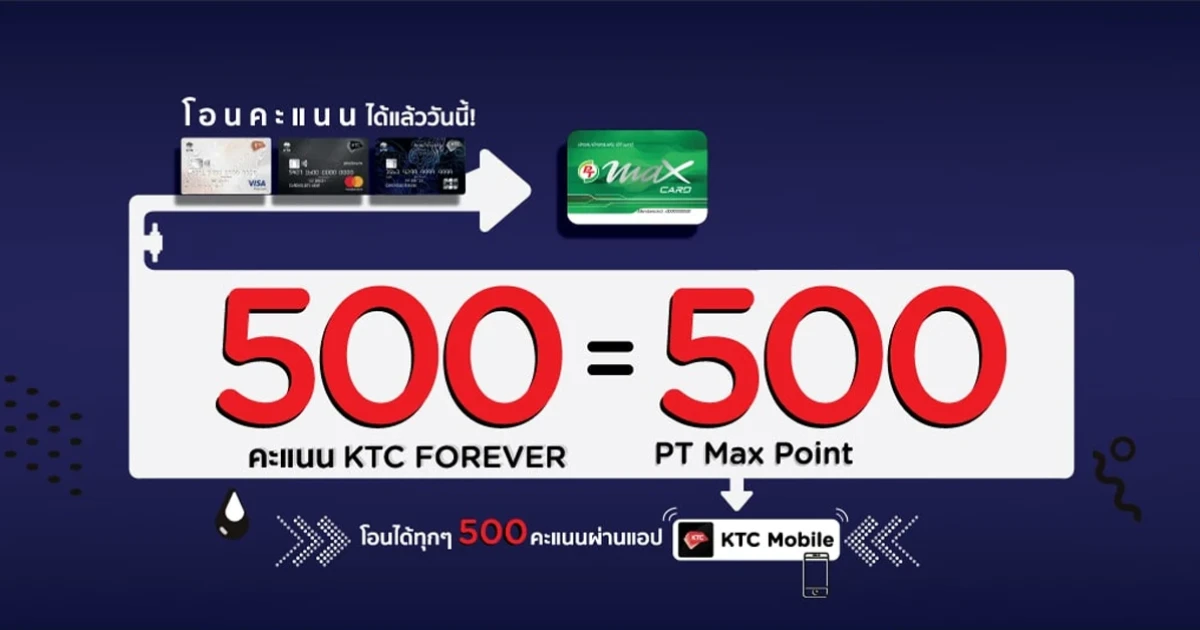 ลูกค้าผู้ถือ บัตรเครดิต KTC โอนคะแนนได้แล้ววันนี้ โอนได้ทุกๆ 500 คะแนน KTC FOREVER ไปเป็น PT Max Point ผ่านแอปฯ KTC Mobile ได้ทันที