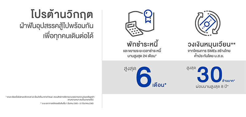 - ลูกค้าสินเชื่อไมโครเอสเอ็มอี (ทุกผลิตภัณฑ์) พักการชำระหนี้ (Skip Payment) สูงสุดไม่เกิน 6 เดือน จากนั้นขยายเวลาการผ่อนชำระหนี้ให้สูงสุดไม่เกิน 24 เดือน รวม Skip Payment (พิจารณาเป็นรายกรณีไป)