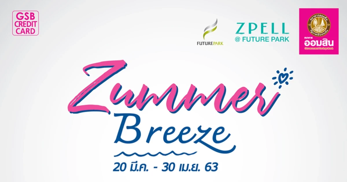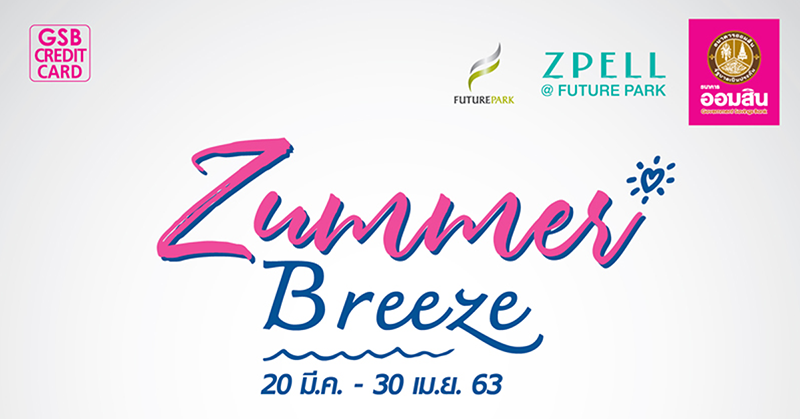 สิทธิพิเศษ สำหรับผู้ถือบัตรเครดิตธนาคารออมสิน รับเครดิตเงินคืน + GSB Reward Point สูงสุด 1,500 บาท (คะแนน)/ตลอดรายการ เมื่อมียอดใช้จ่ายตามเงื่อนไขที่ธนาคารกำหนด ในกิจกรรม Zummer Breeze 20 มี.ค. - 30 เม.ย. 2563 ที่ Future Park และ Zpell