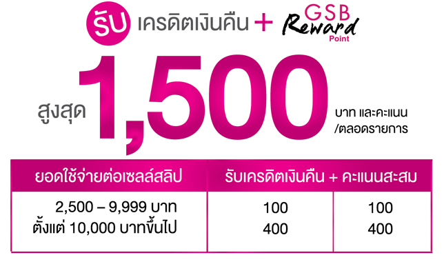 - จำกัดการให้เครดิตเงินคืนสูงสุด 1,500 บาท/บัตร/ตลอดรายการ และคะแนนสะสมพิเศษ GSB Reward Point 1,500 คะแนน/บัตร/ตลอดรายการ