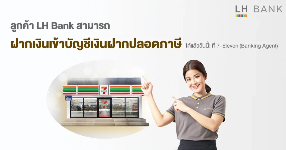 สะดวกยิ่งขึ้นกับบริการทำธุรกรรมทางการเงินผ่านตัวแทนธนาคาร (Banking Agent) ลูกค้า LH Bank สามารถฝากเงินเข้าบัญชีเงินฝากปลอดภาษี ได้แล้ววันนี้! ที่ 7-Eleven โดยวงเงินในการทำรายการตามจำนวนเงินฝากครั้งแรกที่เปิดบัญชี และมีค่าธรรมเนียมในการทำธุรกรรม 15 บาท/รายการ