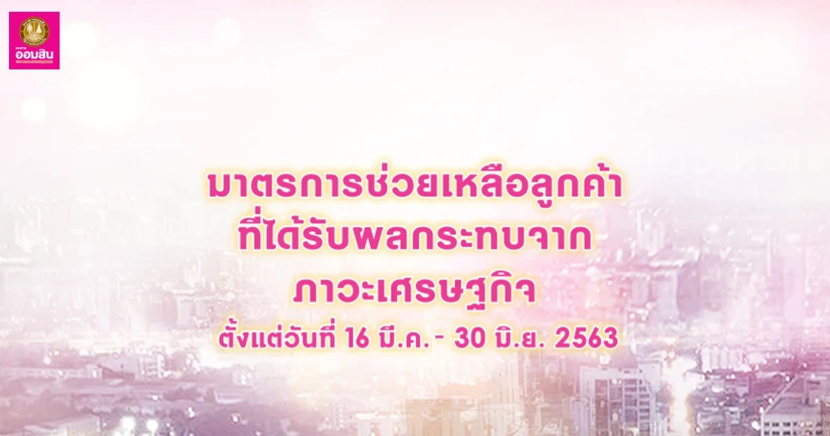 ธนาคารออมสิน ปรับเพิ่มมาตรการให้เข้มข้นขึ้น ช่วยลูกค้าทุกกลุ่มภายใต้ผลกระทบจากภาวะเศรษฐกิจ พิษภัยไวรัสโควิด-19 พักหนี้เงินต้นไม่เกิน 2 ปี ชำระแต่ดอกเบี้ยตั้งแต่ 50-100% ชำระดีติดต่อกันทุก 6 เดือน ได้รับเงินคืน 20% ของดอกเบี้ยที่จ่าย รวม 2 ครั้ง เปิดลงทะเบียนผ่านเว็บไซต์ www.gsb.or.th 16 มี.ค. - 30 มิ.ย. 63 พร้อมจัดเงินกู้เพิ่มเติมเพื่อใช้จ่ายหากจำเป็น วงเงิน 50,000 บาท ดอกเบี้ย 0.50% ต่อเดือน ไม่ต้องมีหลักประกัน ไม่ต้องมีคนค้ำ ปลอดชำระหนี้นาน 6 เดือน