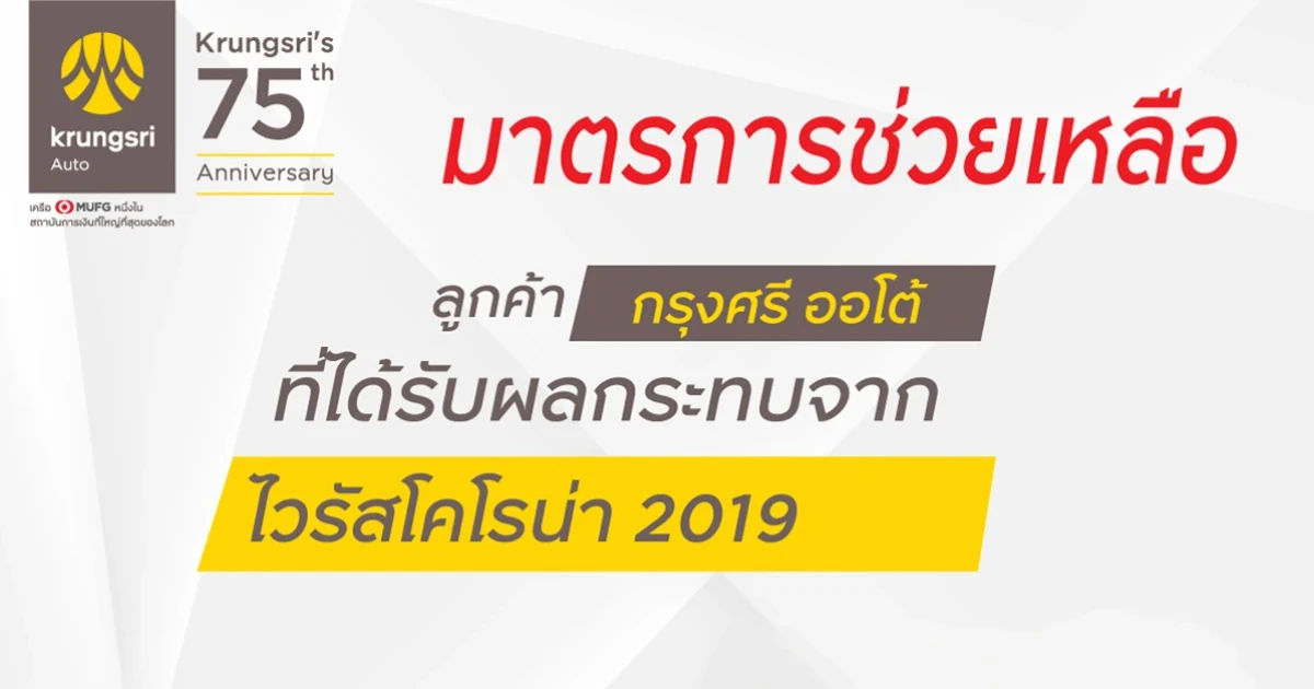 ศึกษารายละเอียดและเงื่อนไขเพิ่มเติมเกี่ยวกับมาตรการช่วยเหลือลูกค้าที่ได้รับผลกระทบจากการแพร่ระบาดของเชื้อไวรัส COVID-19 ได้ที่ https://www.krungsriauto.com/auto/interest/Financial-assistance-package.html