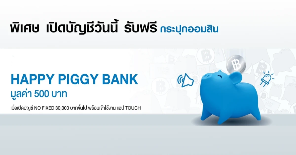 ออมเงินได้สนุกขึ้น ด้วยกระปุกออมสิน สุดน่ารัก เพียงเปิดบัญชี NO FIXED พร้อมฝากเงินขั้นต่ำ 30,000 บาท และเข้าใช้งานแอปฯ TOUCH รับฟรี HAPPY PIGGY BANK (มูลค่า 500 บาท)