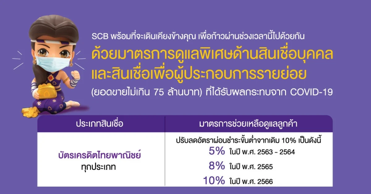 ธนาคารไทยพาณิชย์ พร้อมที่จะเดินเคียงข้างคุณ เพื่อก้าวผ่านช่วงเวลานี้ไปด้วยกัน ด้วยมาตรการดูแลพิเศษด้านสินเชื่อบุคคล และสินเชื่อเพื่อผู้ประกอบการรายย่อย (ยอดขายไม่เกิน 75 ล้านบาท) ที่ได้รับผลกระทบจาก COVID-19