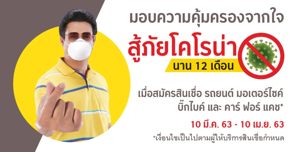 มอบความคุ้มครองจากใจ สู้ภัยโคโรน่า นาน 12 เดือน พิเศษเฉพาะลูกค้าบุคคลธรรมดาที่สมัครสินเชื่อ รถยนต์ มอเตอร์ไซค์ บิ๊กไบค์ และ คาร์ ฟอร์ แคช ด้วยประกันภัย ไวรัสโคโรน่า Corona virus (COVID-19)