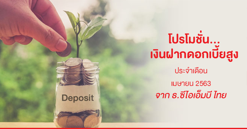 โปรโมชั่นบัญชีเงินฝากดอกเบี้ยสูงประจำเดือนเมษายน 2563 จาก ธนาคารซีไอเอ็มบี ไทย บัญชีเงินฝากประจำแบบมีกำหนดระยะเวลาที่ให้ดอกเบี้ยสูง และสามารถเลือกรับดอกเบี้ยแบบรายเดือน หรือเมื่อครบกำหนดได้