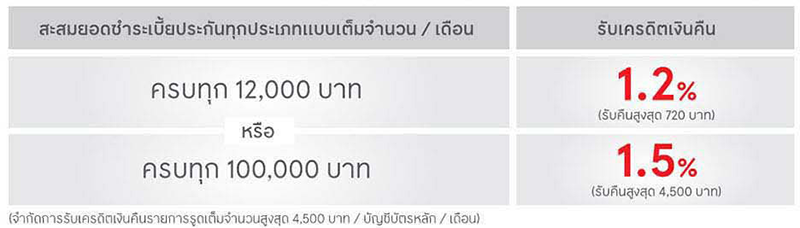 - รับเครดิตเงินคืนจากการชำระเบี้ยประกันทุกประเภท สูงสุด 4,500 บาท / บัญชีบัตรหลัก / เดือน (เท่ากับยอดใช้จ่ายสะสม 300,000 บาท / เดือน) และไม่เกิน 13,500 บาท / บัญชีบัตรหลัก ตลอดรายการ
