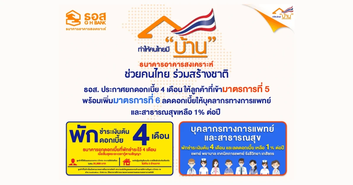 ธอส. ยกดอกเบี้ย 4 เดือน ให้ลูกค้าที่เข้ามาตรการที่ 5 เพิ่มมาตรการที่ 6 ลดดอกเบี้ยให้บุคลากรทางการแพทย์
