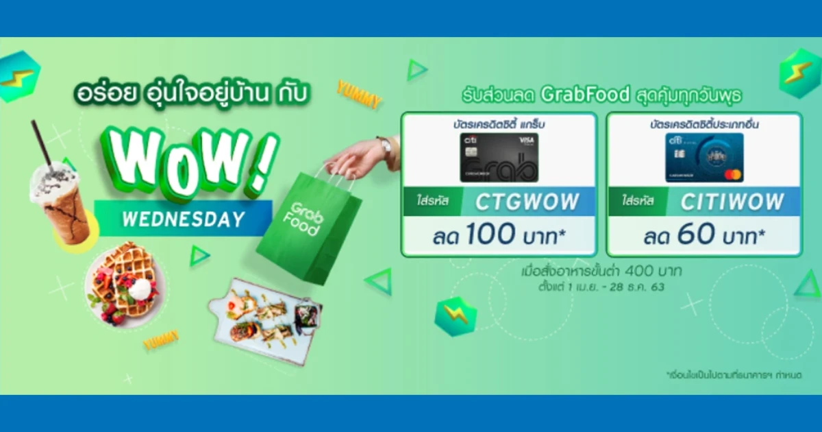 รับส่วนลด Grab Food สุดคุ้มทุกวันพุธ เมื่อใช้จ่ายผ่านบัตรเครดิตซิตี้ ตั้งแต่ 1 เม.ย. - 28 ธ.ค. 63