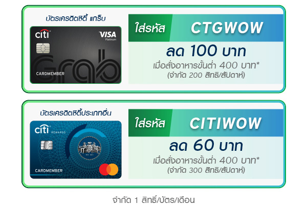 - สมาชิกบัตรเครดิตซิตี้ แกร็บ รับส่วนลดค่าอาหารมูลค่า 100 บาท เมื่อมียอดสั่งขั้นต่ำ 400 บาท (จำกัด 1 สิทธิ์/บัตร/สัปดาห์ และจำกัดสิทธิ์สูงสุด 1 สิทธิ์/บัตร/เดือน)