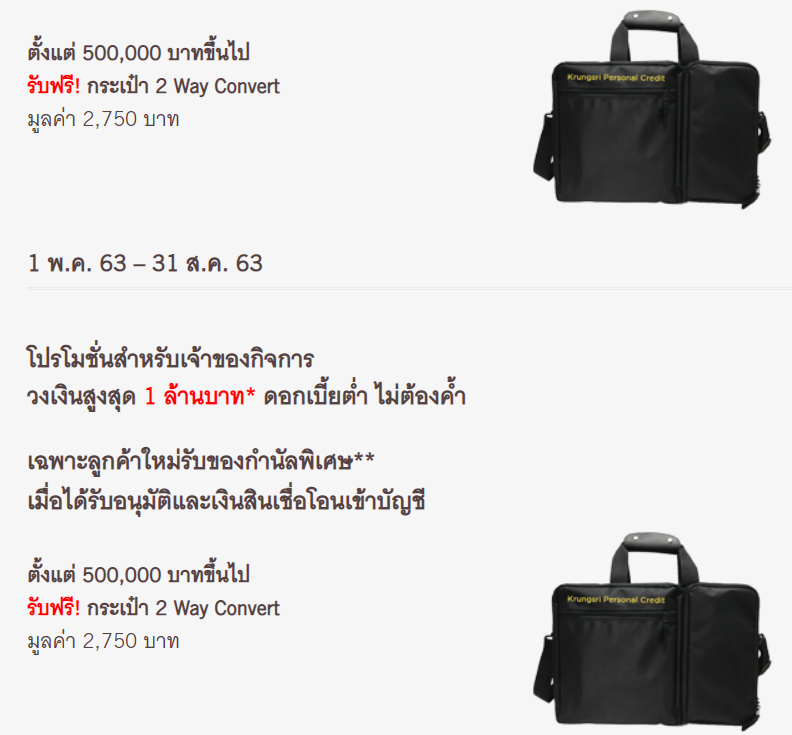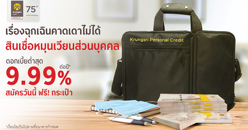 สินเชื่อหมุนเวียนส่วนบุคคล ดอกเบี้ยต่ำสุด 9.99% ต่อปี สมัครวันนี้ ฟรี! กระเป๋า 2 Way Convert