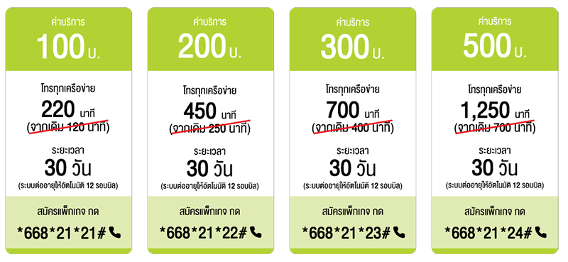 - สำหรับลูกค้าที่มีแพ็กเกจหลักคิดค่าโทรเป็นบาทและโทรฟรีในกลุ่ม เมื่อสมัครแพ็กเสริมโทรจะได้รับค่าโทรเป็นบาท/เดือน