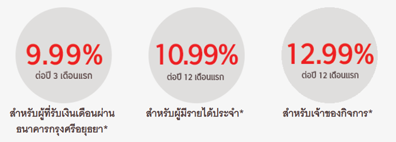 - อัตราดอกเบี้ย 9.99% ต่อปี 3 เดือนแรก สำหรับพนักงานประจำที่รับเงินเดือนผ่านบัญชีของธนาคารกรุงศรีอยุธยา / มีอายุงาน 1 ปีขึ้นไป / มีรายได้ตามหลักเกณฑ์ของธนาคารกรุงศรีอยุธยา และรับเงินกู้โดยวิธีโอนเงินเข้าบัญชีเงินฝากธนาคารเท่านั้น