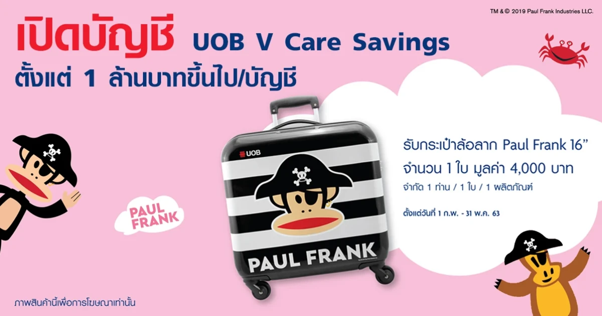 สำหรับลูกค้าใหม่ที่เปิด บัญชีเงินฝากออมทรัพย์ยูโอบี วีแคร์ (UOB Vcare) กับธนาคารยูโอบี และคงยอดเงินฝาก 1 ล้านบาทเป็นต้นไป ติดต่อกันตามระยะเวลาที่กำหนด จะได้รับ Paul Frank Trolley Bag 16 นิ้ว จำนวน 1 ใบ มูลค่า 4,000 บาท