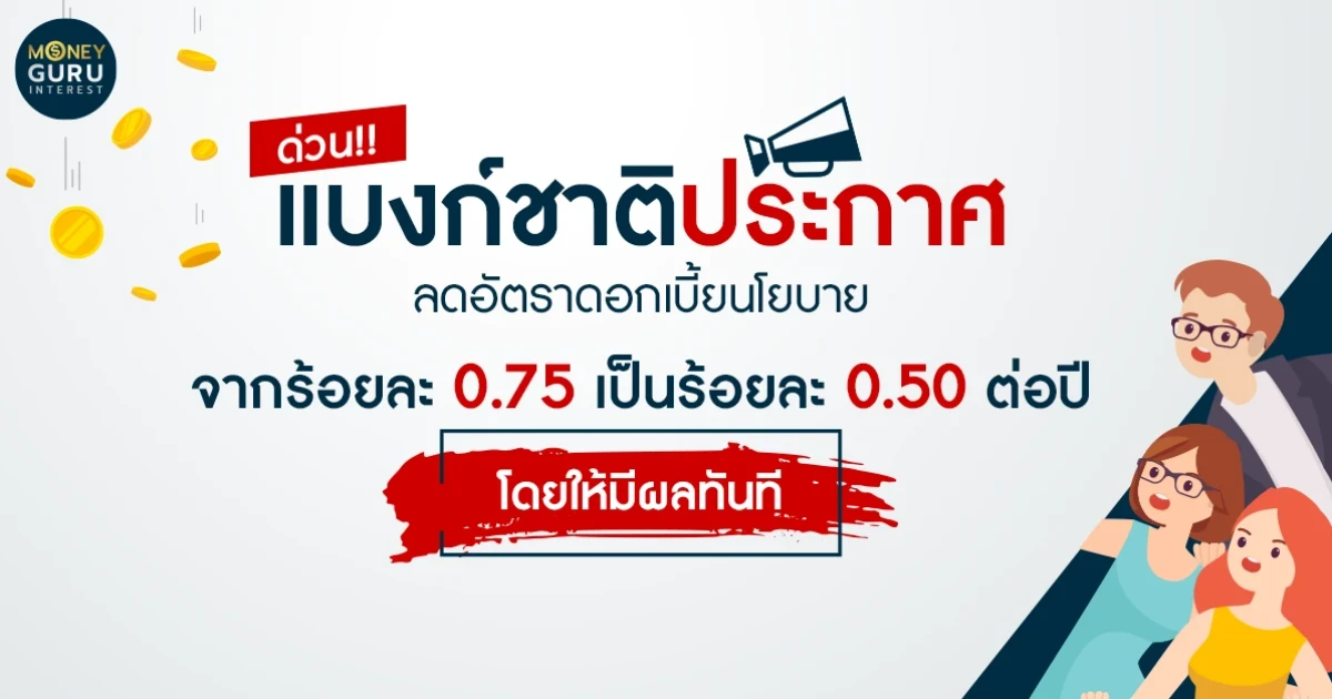 ด่วน!! แบงก์ชาติประกาศลดอัตราดอกเบี้ยนโยบายจากร้อยละ 0.75 เป็นร้อยละ 0.50 ต่อปี โดยให้มีผลทันที