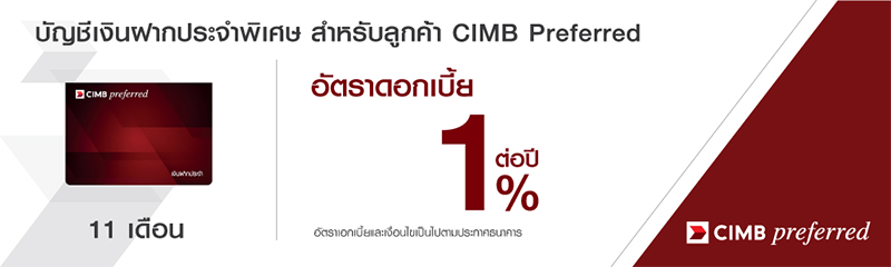 - บัญชีเงินฝากประจำพิเศษ 5, 11 เดือน Preferred* เป็นบัญชีสำหรับลูกค้า CIMB Preferred หรือสำหรับลูกค้า CIMB Thai Private Banking ประเภทลูกค้าบุคคลธรรมดาเท่านั้น หรือสมัครเป็นลูกค้า CIMB Preferred หรือ CIMB Thai Private Banking ในวันและเวลาเดียวกันกับการขอเปิดบัญชี