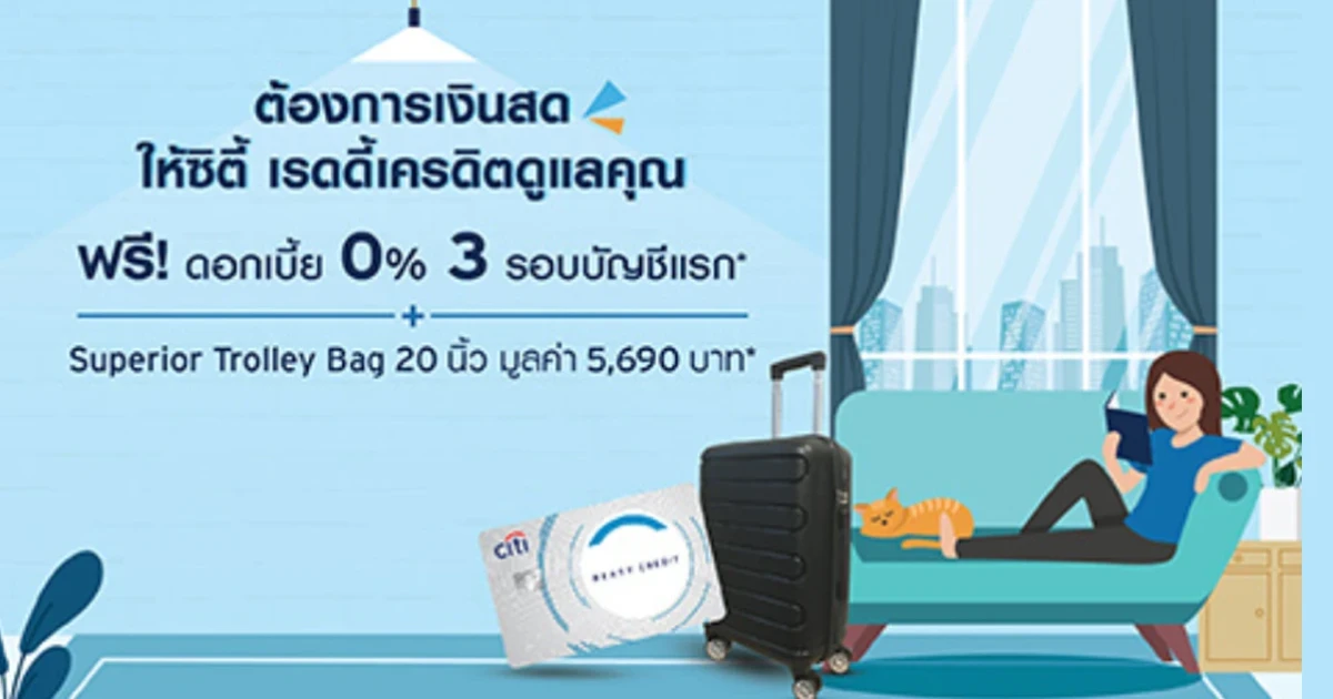 โปรโมชั่นพิเศษ...กดเงินสดฟรี ดอกเบี้ย 0% 3 รอบบัญชีแรก และรับฟรี! กระเป๋าเดินทาง Superior Trolley Bag ขนาด 20 นิ้ว มูลค่า 5,690 บาท สำหรับสมัครบัญชีซิตี้ เรดดี้เครดิต ผ่านทางออนไลน์