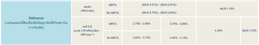 - มี MRTA และวงเงินอเนกประสงค์ตั้งแต่ 10% ของราคาประเมินโดยอัตราดอกเบี้ยวงเงินอเนกประสงค์ใช้อัตราดอกเบี้ยตามประกาศของธนาคารเท่านั้น