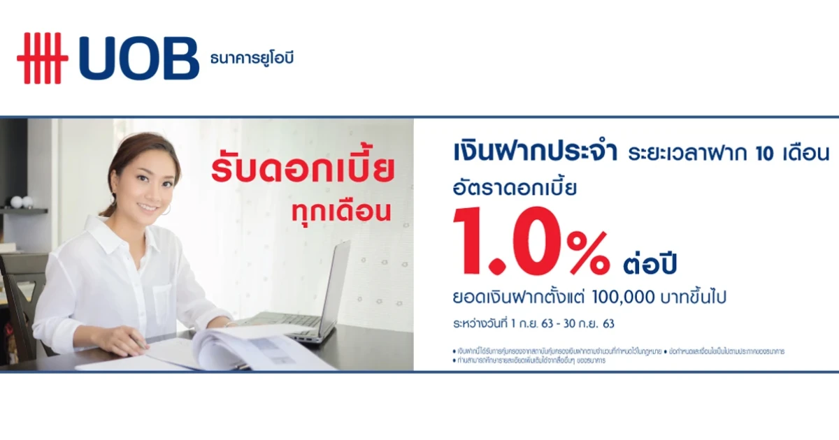 โปรโมชั่นใหม่!! บัญชีเงินฝากประจำระยะเวลาฝาก 10 เดือน จาก ธนาคารยูโอบี ให้ดอกเบี้ยทุกเดือน สูงถึง 1.00% ต่อปี เมื่อมียอดเงินฝากตั้งแต่ 100,000 บาทขึ้นไป