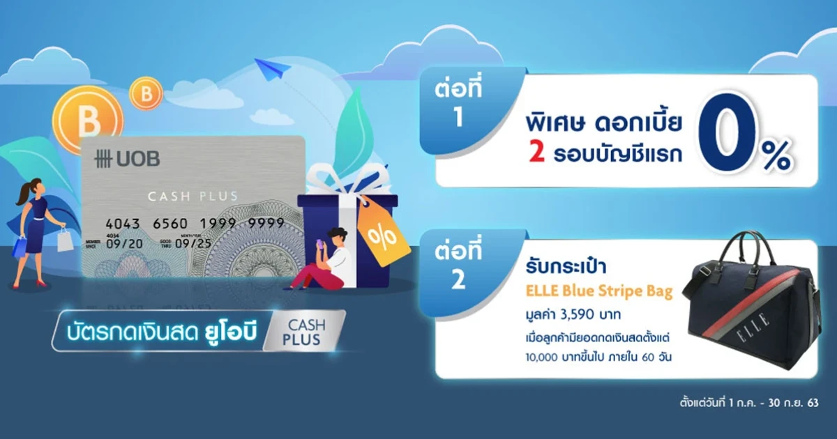- รับกระเป๋า ELLE Blue Stripe Bag ขนาด 18 x 11 x 8 นิ้ว 1 ใบ มูลค่า 3,590 บาท เมื่อมีรายการกดเงินสดผ่านบัตรยูโอบี แคชพลัส ตั้งแต่ 10,000 บาทขึ้นไป ภายใน 60 วัน นับจากวันที่ธนาคารอนุมัติบัตรฯ โดยธนาคารจะจัดส่งกระเป๋าให้ท่านตามที่อยู่ในใบแจ้งยอดบัญชีภายใน 60 วัน นับจากวันที่ท่านกดเงินสดผ่านบัตรฯ จำกัดการรับกระเป๋า 1 ใบ/ผู้ถือบัตร 1 ท่าน/ตลอดรายการ