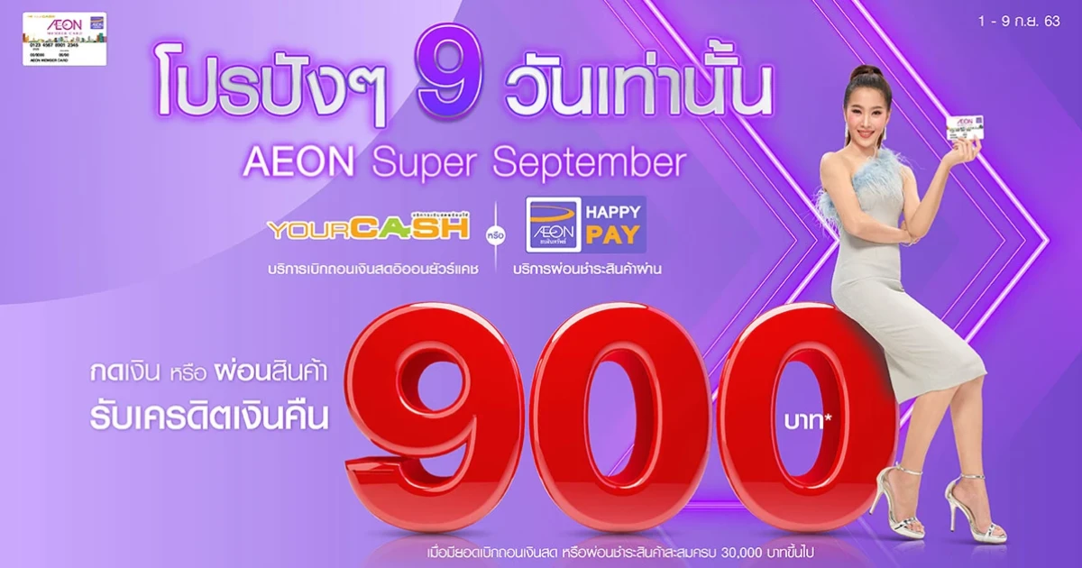 - รับเครดิตเงินคืน เมื่อมียอดเบิก ถอนเงินสด หรือโอนเงิน และ/หรือผ่อนชำระสินค้า (AEON Happy Pay) ผ่านวงเงินสินเชื่อยัวร์แคช สะสมครบ 30,000 บาทขึ้นไป รับเครดิตเงินคืน สูงสุด 900 บาท/ท่าน/ตลอดระยะเวลารายการส่งเสริมการขาย