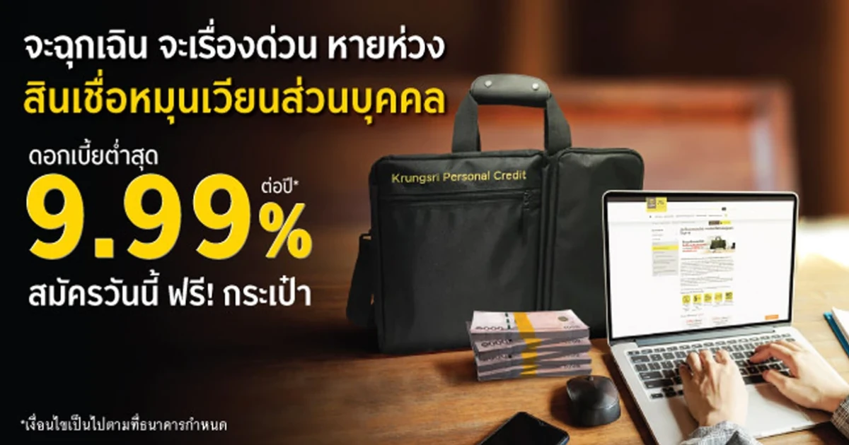 โปรโมชั่นสำหรับผู้มีรายได้ประจำ อนุมัติเร็ว วงเงินสูง ผ่อนสบาย 12 - 60 เดือน ดอกเบี้ยต่ำสุด 9.99% ต่อปี สำหรับผู้ที่กรอกข้อมูลผ่าน www.krungsri.com และรับเงินกู้โดยวิธีโอนเงินเข้าบัญชีเงินฝากธนาคาร