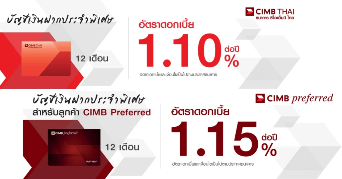 บัญชีเงินฝากประจำพิเศษ 12 เดือน CIMB Preferred and CIMB Thai Private Banking สำหรับลูกค้า CIMB Preferred หรือ CIMB Thai Private Banking ประเภทลูกค้าบุคคลธรรมดาเท่านั้น หรือสมัครเป็นลูกค้า CIMB Preferred หรือ CIMB Thai Private Banking ในวันและเวลาเดียวกันกับการขอเปิดบัญชี