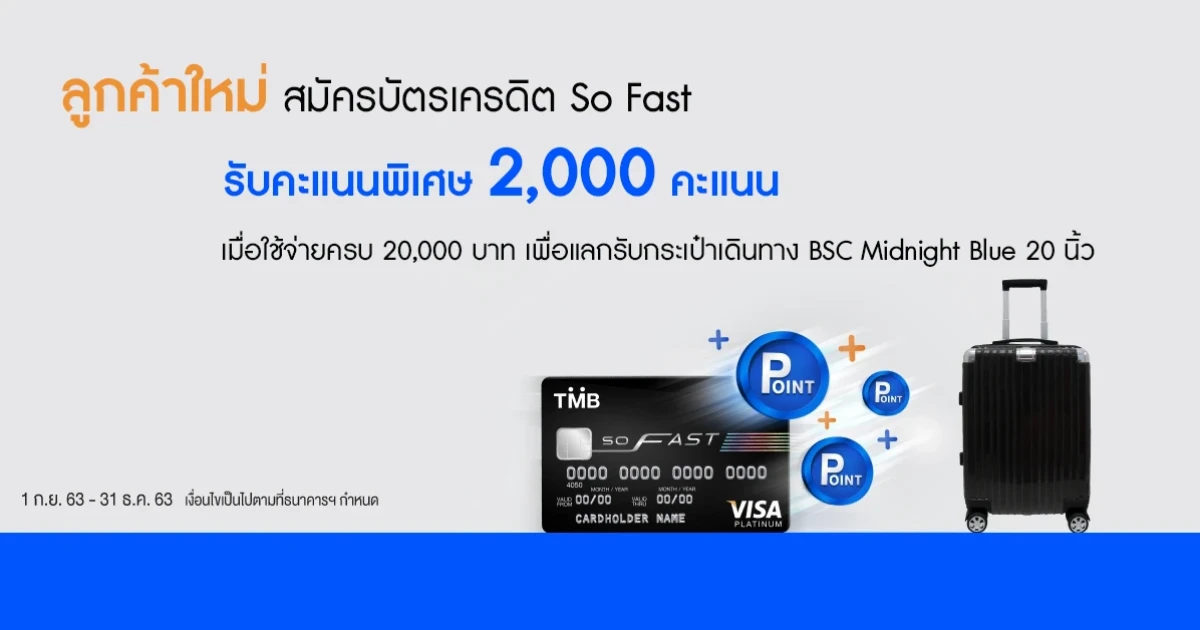 โปรโมชั่นสำหรับผู้สมัครบัตรหลักรายใหม่ที่ยังไม่เคยมีบัตรเครดิต TMB มาก่อน สมัคร บัตรเครดิต ทีเอ็มบี โซ ฟาสต์ (TMB So Fast Credit Card) วันนี้!! รับคะแนนสะสมสูงสุด 2,000 คะแนน เพื่อแลกรับกระเป๋าเดินทาง BSC Midnight blue trolley bag มูลค่า 5,990 บาท เมื่อใช้จ่ายผ่านบัตรครบ 20,000 บาท ภายใน 60 วัน นับจากวันที่บัตรฯได้รับการอนุมัติ
