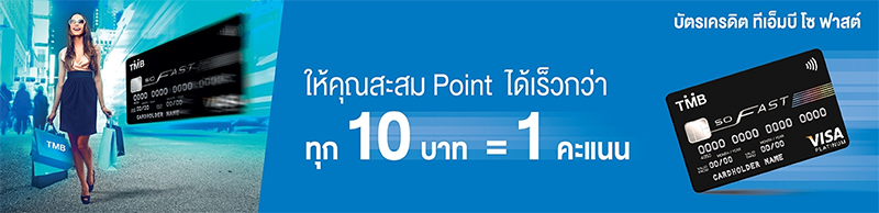 - รับ 1 คะแนนสะสมทีเอ็มบี รีวอร์ด พลัส (TMB Rewards Plus) จากทุกการใช้จ่าย 10 บาท