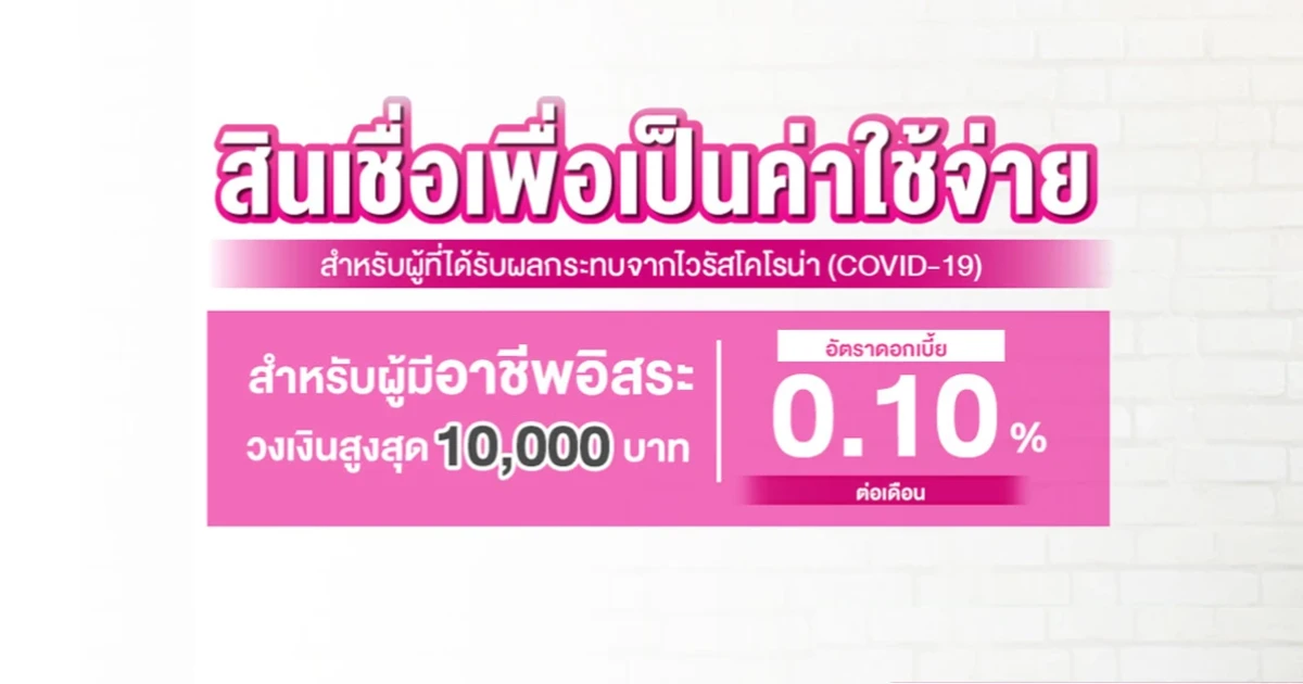 สินเชื่อเพื่อเป็นค่าใช้จ่าย วงเงินสูงสุด 10,000 บาท ดอกเบี้ยต่ำ 0.10% ต่อเดือน