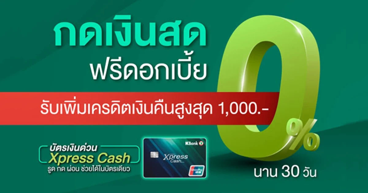 - ลูกค้าที่เข้าร่วมโครงการตามเงื่อนไขข้อ 1 มีสิทธิ์ได้รับข้อเสนออัตราดอกเบี้ยพิเศษ 0% นานสูงสุด 30 วัน โดยเริ่มนับตั้งแต่วันที่ได้รับการอนุมัติ เมื่อสมัครบัตรเงินด่วน Xpress Cash หลังจากครบระยะเวลาที่ได้รับอัตราดอกเบี้ยพิเศษแล้วลูกค้าจะได้รับอัตราดอกเบี้ยปกติตามวงเงินที่ได้รับอนุมัติ