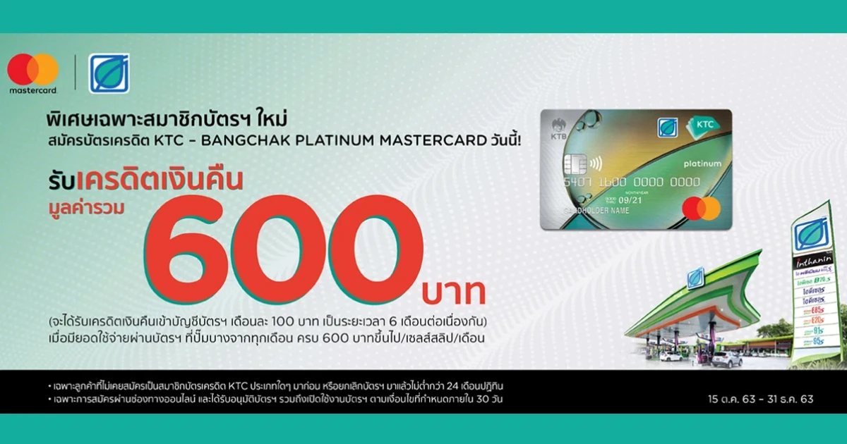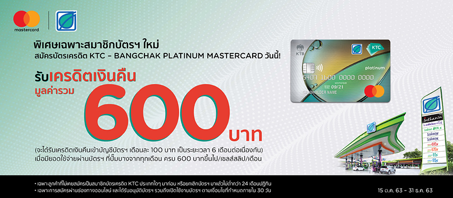สิทธิพิเศษสำหรับลูกค้าใหม่ที่สมัคร บัตรเครดิต KTC - BANGCHAK PLATINUM MASTERCARD วันนี้! รับเครดิตเงินคืนมูลค่ารวม 600 บาท (เดือนละ 100 บาทเป็นเวลา 6 เดือน) เมื่อมีการใช้จ่ายในการเติมนํ้ามัน ณ สถานีบริการนํ้ามันบางจากเป็นเงิน 600 บาท/เซลล์สลิป/เดือน ด้วยบัตรเครดิต KTC BANGCHAK PLATINUM MASTERCARD