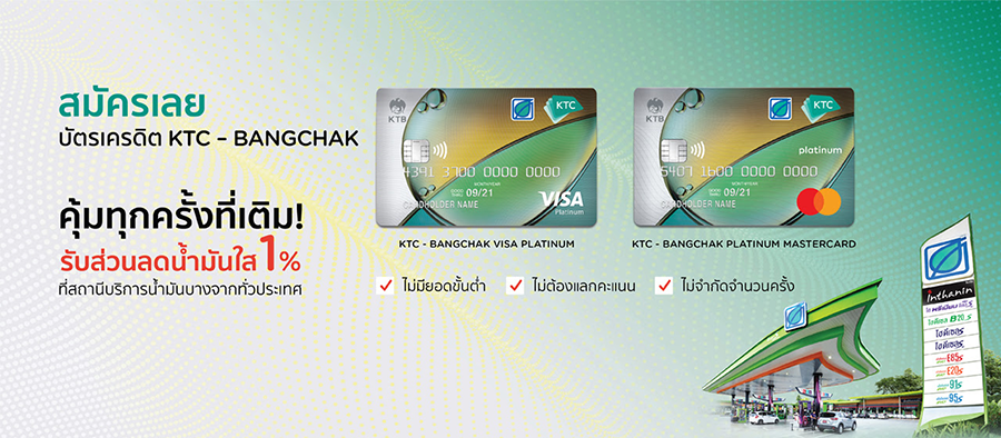 - สมาชิกบัตรเครดิต KTC BANGCHAK ทุกประเภท ยังได้รับสิทธิประโยชน์ในการรับเครดิตเงินคืน 1% จากยอดชําระค่านํ้ามันผ่านบัตรฯ โดยไม่เกิน 3,000/เซลล์สลิป