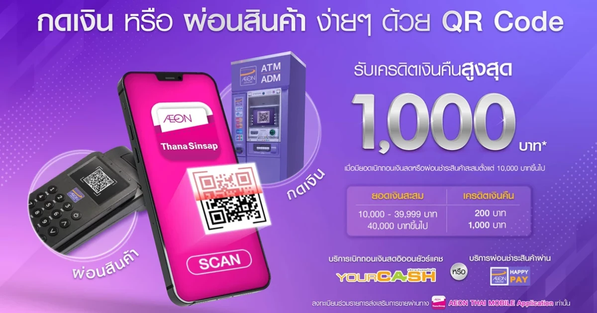 หมายเหตุ: วงเงินเบิกถอนเงินสดเป็นไปตามวงเงินที่ได้รับอนุมัติจากบริษัทฯ ยอดที่ผู้ถือบัตรสามารถเบิกถอนเงินสดได้ ขึ้นอยู่กับวงเงินคงเหลือในบัญชี โดยวงเงินสำหรับเบิกถอนเงินสดอาจมีการเปลี่ยนแปลงขึ้นอยู่กับประวัติการชำระเงิน) - บริษัทฯ สงวนสิทธิ์การให้เครดิตเงืนคืน เฉพาะลูกค้าที่ทำรายการ เบิกถอนเงินสด และ/หรือผ่อนชำระสินค้า โดยไม่ใช้บัตร (ผ่านการสแกน QR CODE) เท่านั้น ลูกค้าที่ทำรายการโดยใช้บัตร ไม่สามารถรวมยอดกับการใช้บริการเบิกถอนเงินสด และ/หรือผ่อนชำระสินค้า (AEON Happy Pay) ผ่านรายการส่งเสริมการขายนี้ได้