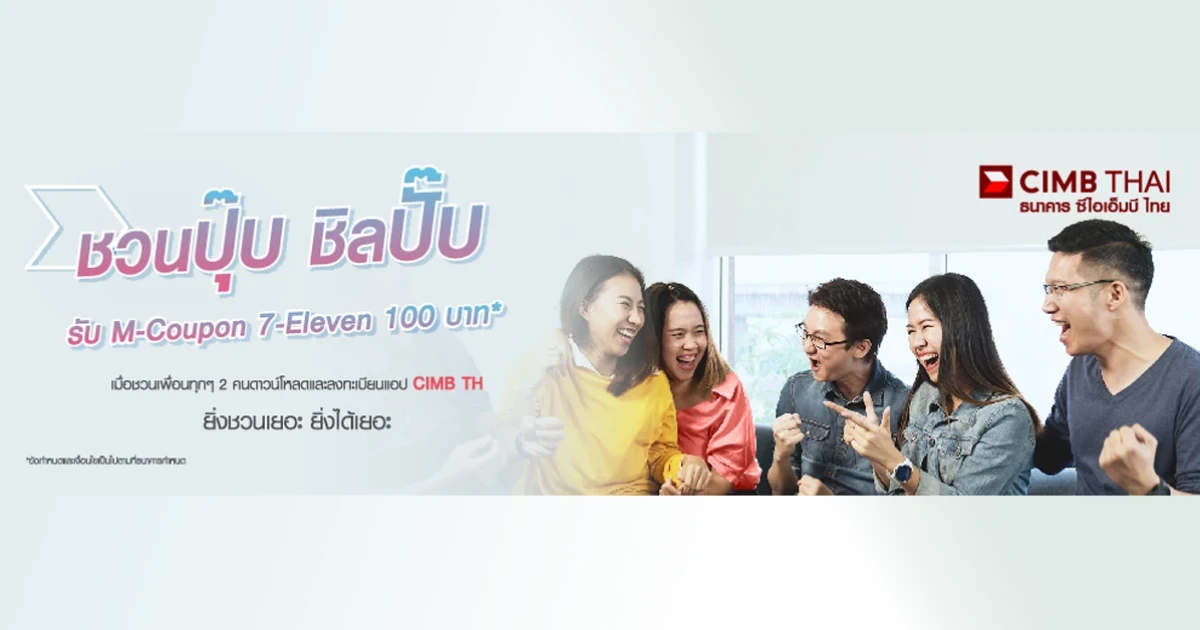 ชวนปุ๊บ ชิลปั๊บ รับ M-Coupon 7-Eleven มูลค่า 100 บาท เมื่อชวนเพื่อนทุกๆ 2 คน ดาวน์โหลดและลงทะเบียนเข้าใช้แอป CIMB Thai Digital Banking