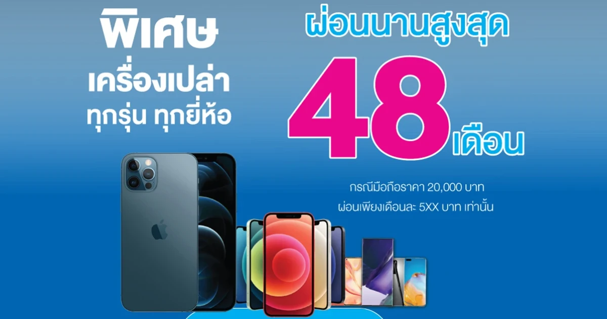 พิเศษ! เครื่องเปล่าทุกรุ่น ทุกยี่ห้อ ผ่อนนานสูงสุด 48 เดือน กรณีมือถือราคา 20,000 บาท ผ่อนเพียงเดือนละ 5XX บาท เท่านั้น...วันนี้ - 31 ธ.ค. 63