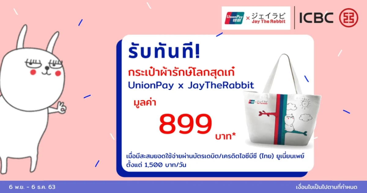 สิทธิพิเศษเฉพาะผู้ถือ บัตรเครดิตไอซีบีซี (ไทย) ยูเนี่ยนเพย์ รับทันที! กระเป๋าผ้ารักษ์โลกสุดเก๋ UnionPay x Jay The Rabbit มูลค่า 899 บาท* เมื่อช้อปสะสมผ่านบัตรเดบิตหรือบัตรเครดิตยูเนี่ยนเพย์ตั้งแต่ 1,500 บาทขึ้นไปต่อวัน