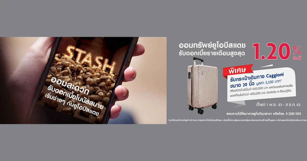 บัญชีเงินฝากออมทรัพย์ยูโอบีสแตช (UOB STASH) ทางเลือกใหม่สำหรับการออมเงินกับบัญชีออมทรัพย์แบบไม่มีสมุดคู่ฝาก พิเศษ! ออมวันนี้...รับกระเป๋าเดินทาง Caggioni ขนาด 20 นิ้ว มูลค่า 5,550 บาท* เมื่อเปิดบัญชีขั้นต่ำ 600,000 บาท และมียอดเงินฝากเฉลี่ยของเดือนไม่น้อยกว่า 600,000 บาท ติดต่อกัน 4 เดือนปฏิทิน
