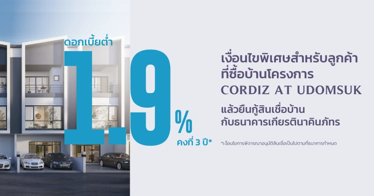 พิเศษ! ดอกเบี้ยเพียง 1.9% คงที่ 3 ปี เพียงซื้อบ้านโครงการ CORDIZ AT UDOMSUK แล้วยื่นกู้สินเชื่อบ้านกับธนาคารเกียรตินาคินภัทร