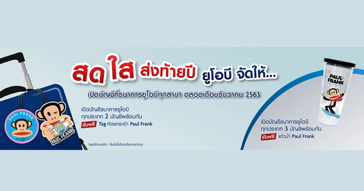 - เปิดบัญชีออมทรัพย์ยูโอบี ทุกประเภทพร้อมกัน 2 บัญชี ตั้งแต่ 1,000 บาท ต่อบัญชี ระหว่างวันที่ 5 - 31 ธ.ค. 63 ลูกค้าจะได้รับ Paul Frank Bag Tag จำนวน 1 ชิ้น มูลค่า 290 บาท