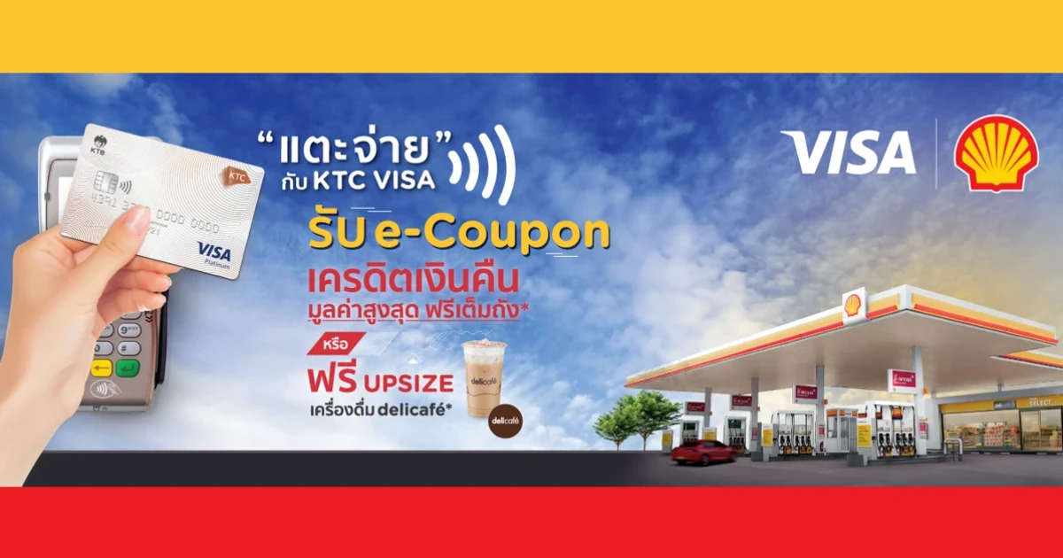 แตะจ่ายด้วยบัตร KTC VISA ทุกครั้ง คุ้มทุกบิล! ที่ปั๊ม Shell รับทันที! e-Coupon เครดิตเงินคืน หรือ ฟรี UPSIZE เครื่องดื่ม delicafe' ทุกบิล ทุกถัง ทุกครั้งที่เติม! เมื่อเติมน้ำมันเชลล์ผ่านบัตร KTC VISA แบบ "แตะเพื่อจ่าย (Contactless)" ครบ 1,000 บาทขึ้นไป/เซลส์สลิป ที่ปั๊มเชลล์ทุกสาขาทั่วประเทศ